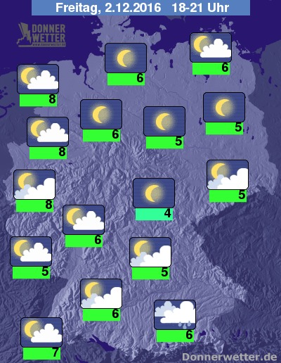 Heute Abend ist es über der Nordosthälfte Deutschlands verbreitet sternenklar und dazu trocken. Weiter nach Südwesten hin werden die Wolken hingegen zahlreicher und vor allem im Süden auch oft dicht, dabei kann es hier auch etwas regnen, sonst bleibt es jedoch weitgehend trocken. Die Abendwerte liegen bei 4 bis 8 Grad.