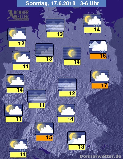 In der Nacht zum Sonntag sind am Oberrhein, sowie von Brandenburg bis zur Ostsee gebietsweise Schauer und auch Gewitter möglich. Im übrigen Land zeigt sich der Himmel dagegen meist nur locker bewölkt oder sogar sternenklar, dazu bleibt es trocken. Die Temperatur sinkt auf 17 Grad in der Lausitz und bis 11 Grad im Saargau.