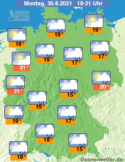 Heute Abend klingen die Schauer auch im übrigen Norden ab und es kann gebietsweise auflockern. Weiter nach Süden hin ist es noch meist stark bis dicht bewölkt, jedoch werden auch hier die Schauer insgesamt etwas seltener. Die Sonne zeigt sich jedoch auch nur hin und wieder mal. Die Temperatur liegt bei 15 Grad im Berchtesgadener Land und bis 21 Grad im Rheinland.