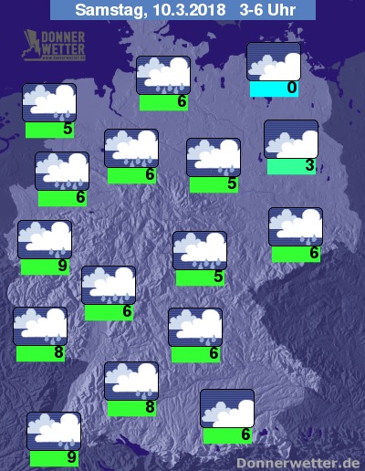 In der Nacht zum Samstag halten sich verbreitet dichte Wolken, dazu bleibt es im Alpenvorland und im Nordosten des Landes trocken, sonst fällt hingegen zeitweise Regen. Die Temperatur sinkt auf 9 Grad im Breisgau und bis 0 Grad in Vorpommern.