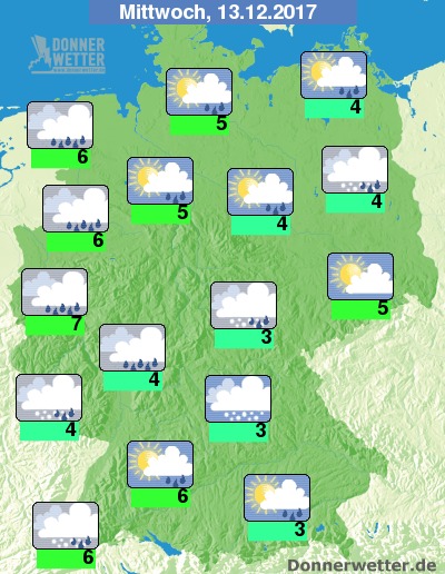 Am Mittwoch ist es vor allem über der Osthälfte häufig noch locker bis aufgelockert bewölkt und meist trocken. Von Westen her ziehen jedoch dichte Wolken und Regen auf, dabei fällt anfangs zum Teil Schneeregen oder Schnee. Es besteht stellenweise Glättegefahr! Die Temperatur steigt auf 3 bis 7 Grad.
