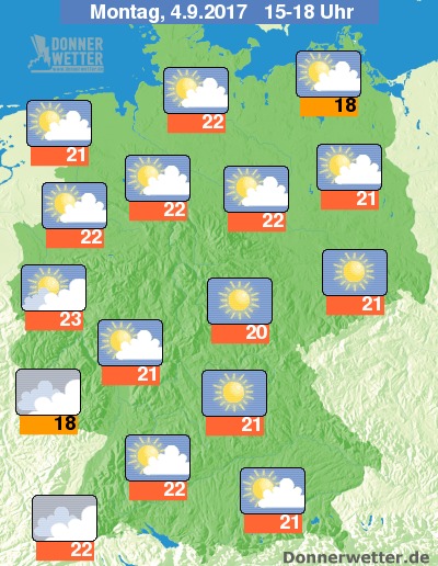 Die Temperaturen erreichen Höchstwerte um 18 Grad C an der Ostseeküste und um 23 Grad C im Rheinland.