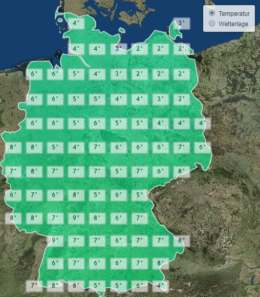 Dabei weisen auch die Höchsttemperaturen am Nachmittag ein eindeutiges Gefälle von Südwesten nach Nordosten auf. Während das Thermometer in Nordbaden auf fast zweistellige Höchstwerte klettert, liegen diese unter dem Einfluss wesentlich kühlerer Luftmassen im Nordosten nur knapp über dem Gefrierpunkt.