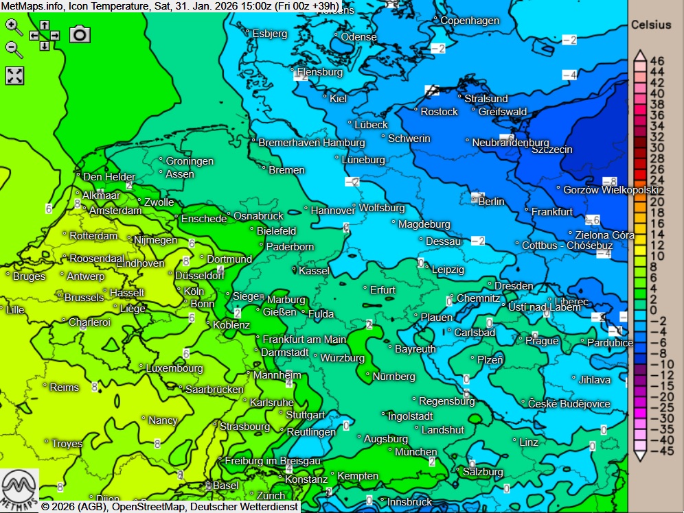 Die Temperaturen erreichen in der Nordosthälfte Werte zwischen -4 und 1 Grad, die höchsten Temperaturen werden mit Spitzenwerten um 10 Grad im Rheintal erreicht.