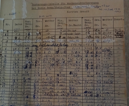 Am 18.5. 1991 gab es die erste Medienvorhersage vom Vorläuferunternehmen (Brandt-Wetter) von Donnerwetter.de. Seit über 22 Jahren erstellt das Team von Donnerwetter.de Wettervorhersagen für kleine und große Medien in ganz Deutschland. In der abgebildeten Tabelle ist das Datum und das vorhergesagte Wetter aus dem Jahr 1991 vermerkt.