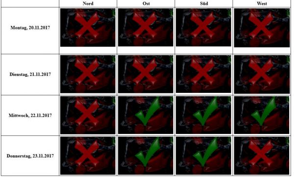 Besonders der Montag und der Dienstag werden wohl landesweit häufig nass und ungemütlich kalt draußen werden. Für den Mittwoch können Planungen im Außenbereich jedoch wieder stattfinden, denn mit Ausnahme des Nordens deutet sich hier trockenes und teils freundliches Wetter an. Am Donnerstag ziehen im Norden und Westen wieder dichte Regenwolken auf, sonst sind die Wetterkonditionen jedoch gar nicht so schlecht.