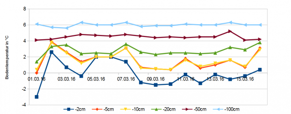 Die folgende Grafik zeigt den bisherigen Märzverlauf der Bodentemperaturen in Tiefen zwischen 2 und 100 cm an unserer Wetterstation in Bonn:
