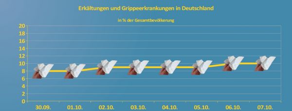 Da verwundert es nicht, dass auch die Erkältungs- und Grippezahlen wieder ansteigen. Bis Anfang kommender Woche schlagen sich 10% der Bevölkerung mit Husten und Schnupfen herum.