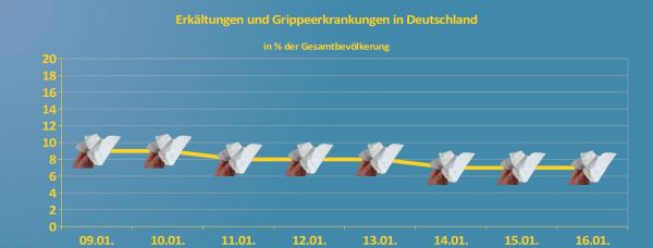 Vor allem im Dezember sorgten Grippe- RS- und Coronaviren für einen hohen Krankenstand in der Bevölkerung. Das Schlimmste scheint nun überwunden, für die zweite Januarwoche rechnen wir mit einer abnehmenden Zahl von Erkältungen und Grippeerkrankungen. Bis zum Wochenende sind um die sieben Prozent von einem solch winterlichen Leiden betroffen.