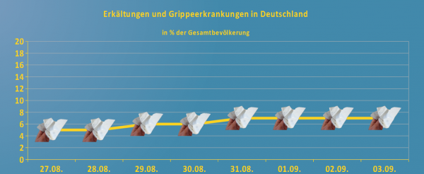 Die letzte Augustwoche trifft rund 5 bis 7 % der Bevölkerung in Deutschland, da das unbeständige und doch recht kühle Wetetrlage eine Grippe leicht herbei ruft. Doch die Wetterbesserung zur Wochenmitte macht dies wieder satt. Dort erwarten uns Werte um die 30 Grad C und viel Trockenheit.