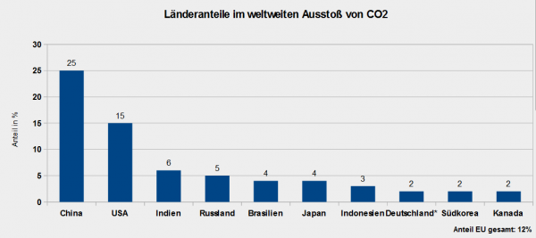 Mit diesen Prozentsätzen sind die in der Grafik aufgeführten Staaten am aktuellen weltweiten CO2-Ausstoß beteiligt: