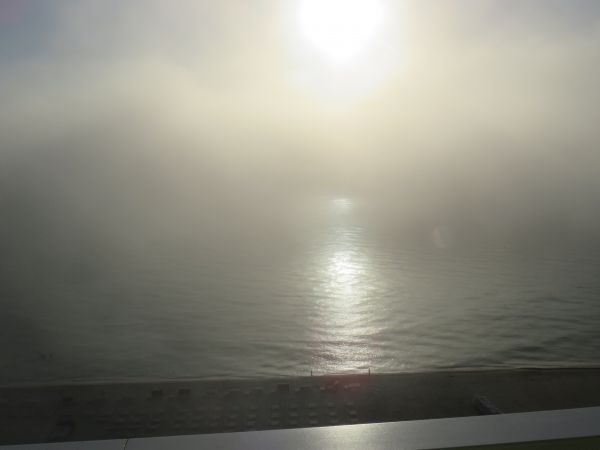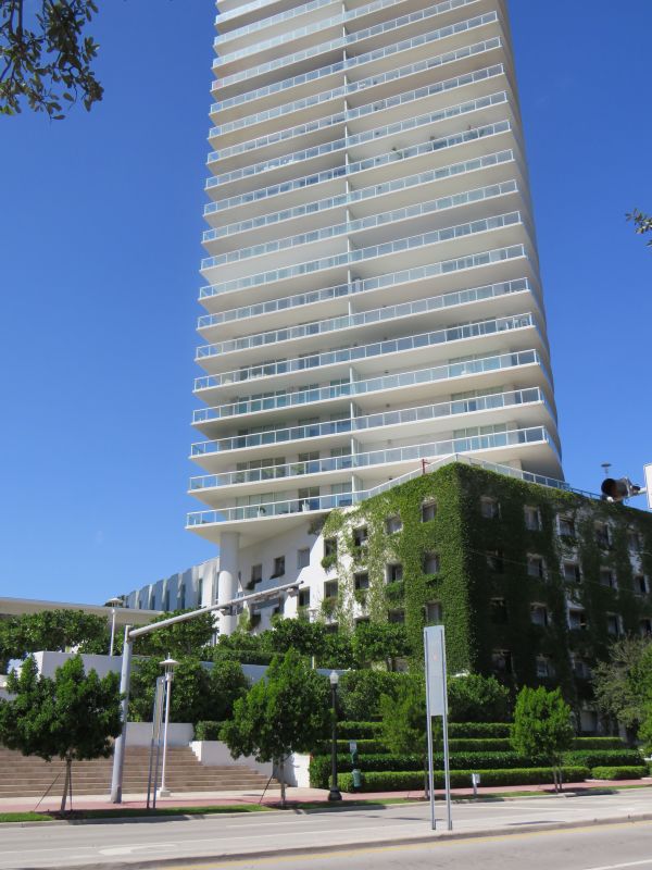 In den siebziger Jahren hat man in Miami Beach Strandsicherung betrieben. Einen Pflanzengürtel durch das Militär angepflanzt, der jetzt überlebenswichtig wird. Er wird das Wasser am Strand zu den Hotels bremsen. Es sind nur wenige Meter, wie hier beim weltberühmten aus 007 bekannten Hotel Fountainebleau Miami Beach zu sehen ist.