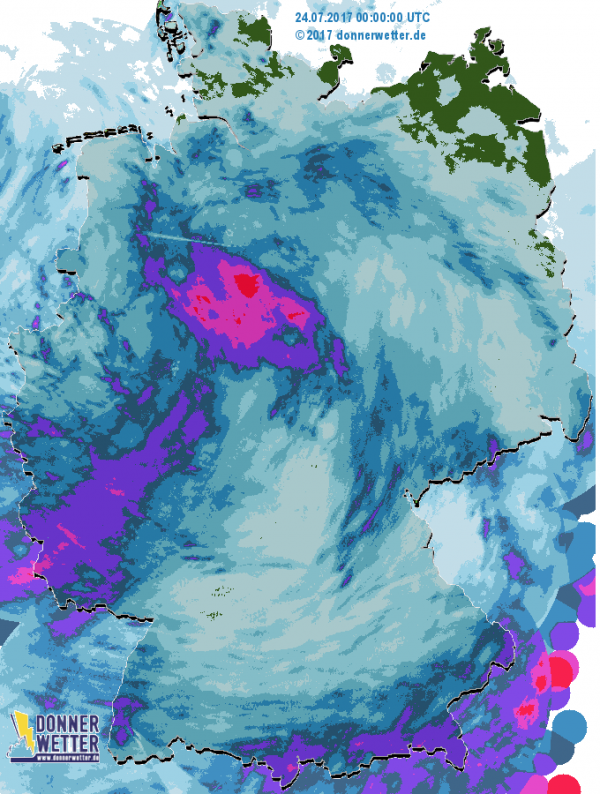 Abgesehen von meist nur kurzen sonnigen Phasen fiel am Montag (24.07.) gebietsweise kräftiger Regen oder es gingen Schauer und örtliche Gewitter nieder. Dabei blieb es mit 16 bis 22 Grad C oft auch ziemlich kühl. Am freundlichsten war es im Nordosten. Dort schien für längere Zeit die Sonne und die Temperaturen konnten auf angenehm warme 25 Grad C klettern.