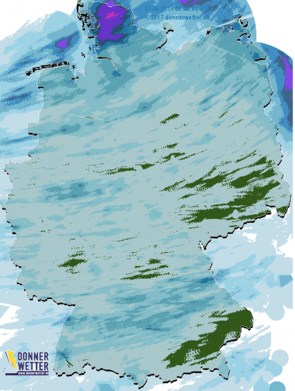Ein Sturmtief über der Nordsee sorgte am Mittwoch (07.06.) in Deutschland für kräftige Windböen und kühles Schauerwetter mit örtlichen Gewittern und Temperaturen meist unter 20 Grad C. In Norddeutschland regnete es auch für längere Zeit. Dabei fielen im nördlichen Schleswig-Holstein über 20 Liter Niederschlag pro Quadratmeter.