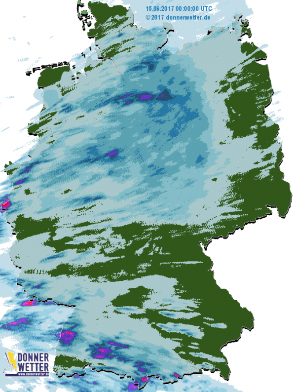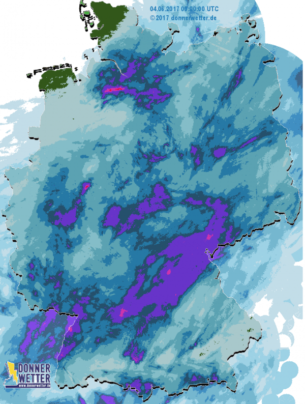Am Samstag (03.06.) entwickelten sich bei schwül-warmen Temperaturen von 23 bis 29 Grad C verbreitet teils kräftige Schauer und Gewitter. Am trockensten blieb es dabei noch in der Lausitz und in Bayern. In der Nacht auf Pfingstsonntag zog von Frankreich her ein mächtiges Regengebiet nach Deutschland. Örtlich blitzte und donnerte es, zum Teil gab es Niederschlagsmengen zwischen 25 und 50 Liter pro Quadratmeter, stellenweise fiel sogar noch mehr.