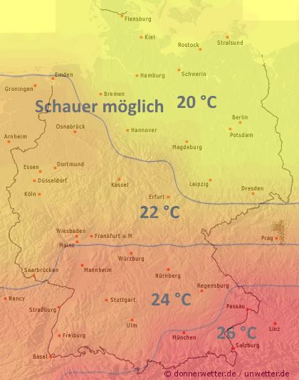 Am Samstag (24.06.) war es im Norden eher trüb und bei Temperaturen von 17 bis 21 Grad C regnete es gebietsweise. In der Mitte wechselten sich Sonne und Wolken ab. Im Süden schien mit Ausnahme vom Alpenrand bei sommerlichen 25 bis 29 Grad C für längere Zeit die Sonne. Im Raum Regensburg wurden sogar nochmals knapp 32 C Grad gemessen.