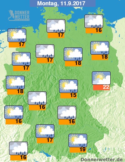 An der Oder und in Südostbayern blieb es am Montag (11.09.) am längsten trocken. Dort wurden mit längeren sonnigen Abschnitten auch Temperaturen von zum Teil über 20 Grad C gemessen. Sonst gab es bei einem böigen Südwestwind und Temperaturen von 14 bis 19 Grad eine aprilwettrige Mischung aus Sonne und Regengüssen.