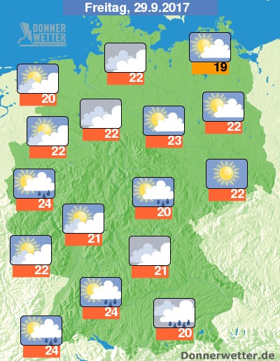 Am Freitag (29.09.) wurde es gebietsweise freundlich mit längeren sonnigen Abschnitten und bei Höchsttemperaturen von 20 bis 25 Grad C spätsommerlich warm. Teilweise zogen aber auch dichtere Wolken übers Land, die vor allem im Westen und in der Südhälfte örtlich etwas Regen oder einzelne teils gewittrige Schauer brachten. Am späten Abend zogen teils gewittrige Regengüsse in den Nordwesten herein.