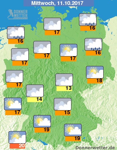 Während südlich der Donau und im Breisgau am Mittwoch (11.10.) für längere Zeit die Sonne schien und sich die Luft teilweise auf nahe 20 Grad C erwärmen konnte, blieb der Himmel im großen Rest meist wolkenverhangen und grau (s. Karte unten). Ganz im Norden regnete oder nieselte es bei einem spürbaren Südwestwind auch zeitweise. Dementsprechend verhielten sich die Temperaturen auch etwas gedämpfter.
