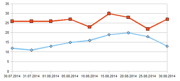 Die Gewitter ziehen nach 5.8. ab und es wird trockener. Die Schwüle lässt im Laufe des Monats nach. Der Tropensommer 2014 ist dann endgültig vorbei. Häufig wechseln Hochdrucklagen mit schönem Wetter und kurze Tiefdruckstörungen mit wenig Regen und kurzzeitig kühlerer Luft ab. Es wird leicht zu warm und etwas zu trocken. Hier unten die gleitende Temperaturprognose für den August.