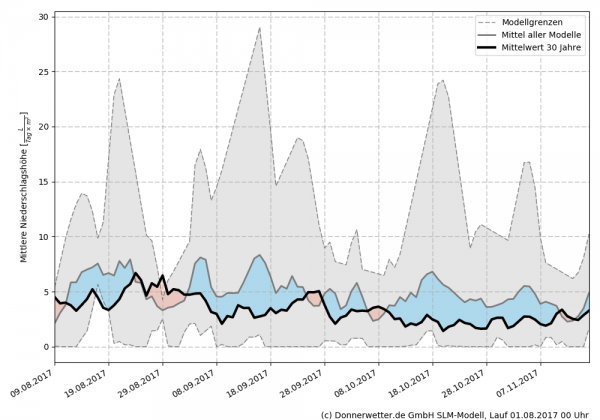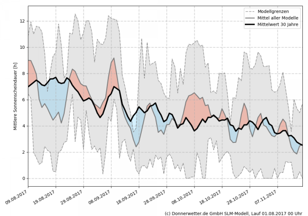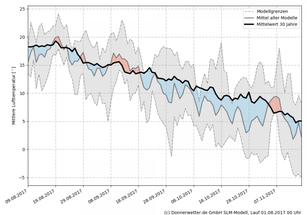 Über weite Strecken zu kühl und zu nass berechnet unser Langfristmodell aktuell den Zeitraum bis Anfang November für den Süden Deutschlands. Immerhin auf die Sonne muss nicht gänzlich verzichtet werden: Vor allem zwischen Ende August und Mitte September sowie im Oktober ist sie auch mal über längere Zeit präsent.