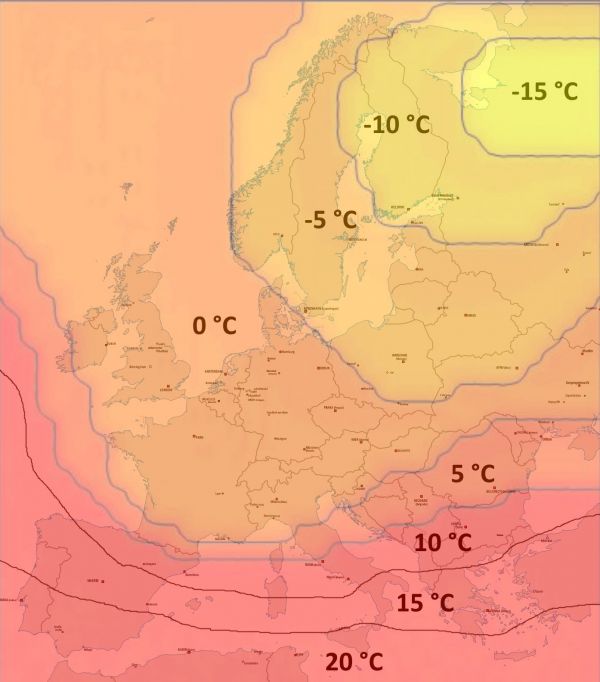 Die folgende Karte zeigt die durchschnittlichen, nächtlichen Tiefsttemperaturen in Europa Ende November.