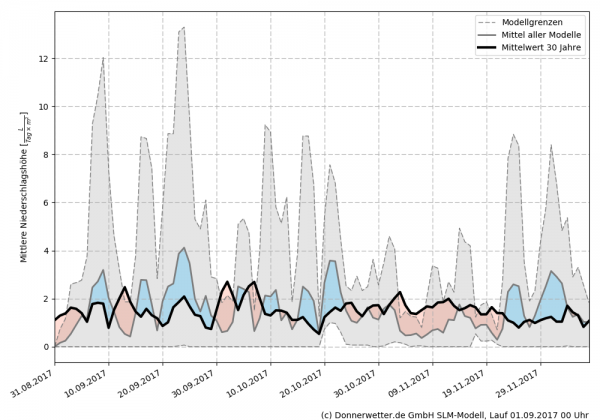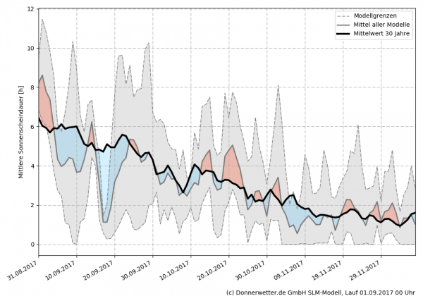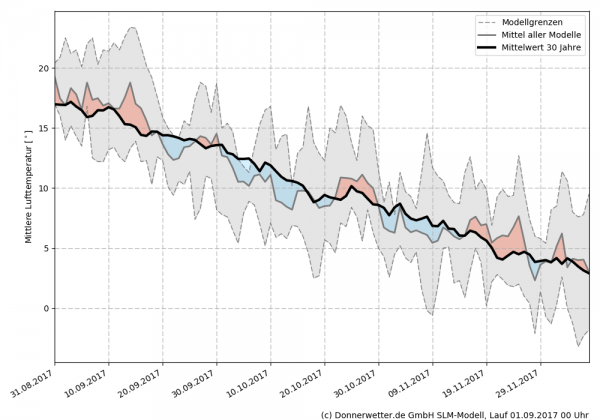 Nach einem anfangs eher milden Start in den September und den meteorologischen Herbst, liegen die mittleren Temperaturen ab der zweiten Monatshälfte häufig unter den langjährigen Durchschnittswerten. Beim Niederschlag berechnet unser Modell für die nächsten Wochen aktuell ein stetiges Auf und Ab, die zu erwartende Sonnenscheindauer liegt meist unter dem langjährigen Mittel
