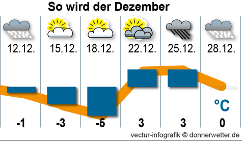 Unwahrscheinlich ist, dass die Kaltluft in diesem Monat einen Bogen um uns machen wird. Ab der Monatsmitte deuten sich mit Hochdruckeinfluss aktuell deutlich kühlere Temperaturen an. In der letzten Dezemberdekade könnte es dann nochmals winterlich werden.