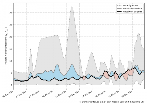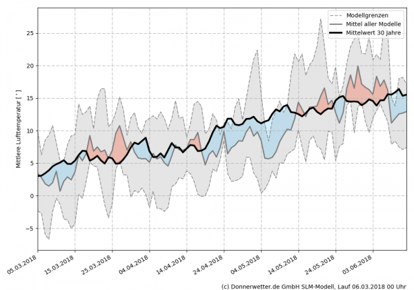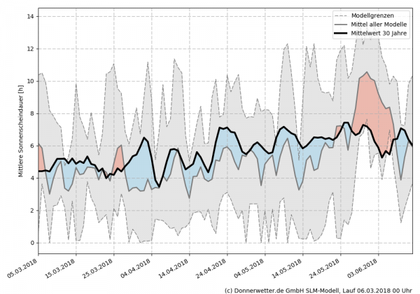 Nach einer zu kalten Wetterphase erreichen die zu erwartenden Mitteltemperaturen laut aktueller Berechnungen ab der letzten Monatsdekade wieder überdurchschnittliche Werte, bevor es Anfang April wieder "bergab" geht. Die Niederschlagsmengen liegen dabei meist meist leicht über dem Mittel, die Anzahl der prognostizierten Sonnenstunden darunter.