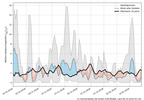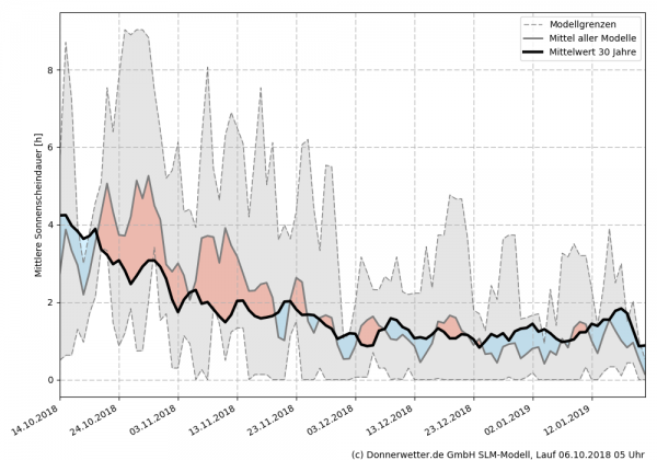 Den mittleren Lufttemperaturen gelingen in den kommenden Wochen im Norden zwar kleine Sprünge nach oben , die Anzahl der berechneten Sonnenstunden hingegen zeigen eine Schwachstelle bis zur letzten Woche im Oktober. Die Tagesniederschlagssummen bewegen sich bis zu diesem Zeitpunkt auch bei überdurchschnittlichen Werten.