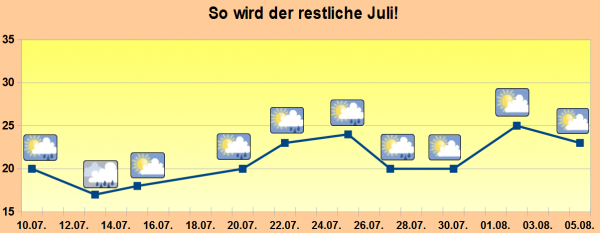 Im Verlauf der kommenden Woche erhält wieder wechselhaftes Wetter Einzug im Land, ab Ende Juli könnte es dann mit den Temperaturen aber wieder ein wenig bergauf gehen. Von beständigem Hochsommerwetter kann aber auch dann nicht die Rede sein. Der August beschert uns dann wieder zögernd mehr Sonne.