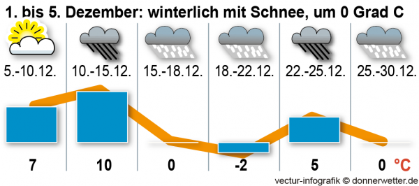 Doch allzu fern ist die erste winterliche Phase nicht mehr. Die Grafik unserer heutigen Langfristprognose widmet sich ganz dem Monat Dezember. Der wartet zwar auch über weite Teile mit Plustemperaturen auf, ein "Hauch von Winter" ist ab der Monatsmitte aber zu spüren.