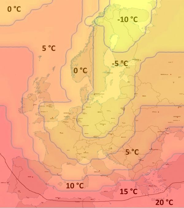 Die Karte zeigt die Anfang Februar zu erwartenden Tagestiefsttemperaturen in Europa.