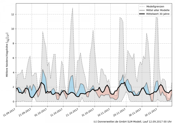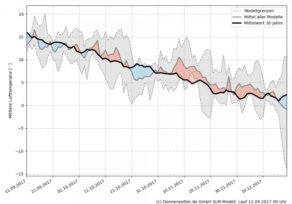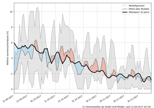 Zumindest im September gelingen dem Altweibersommer im Osten keine großen Sprünge mehr. In den Wochen danach berechnet unser aktuelles Langfristmodell  zeitweise zu milde Temperaturen, vor allem der Zeitraum Mitte November bis Mitte Dezember sticht hier heraus. In den letzten beiden Dekaden von Oktober und November gibt es zudem mehr Sonnenstunden als üblich.