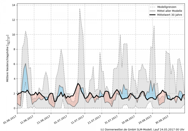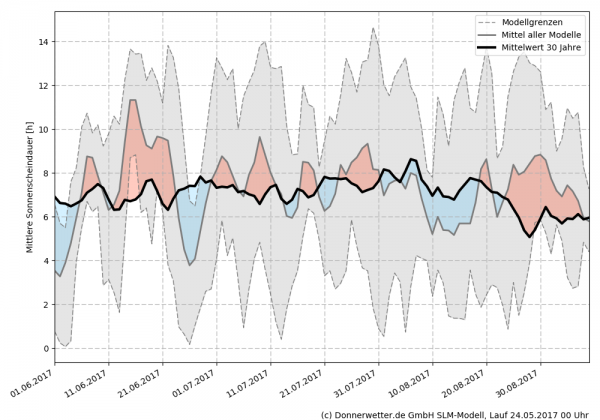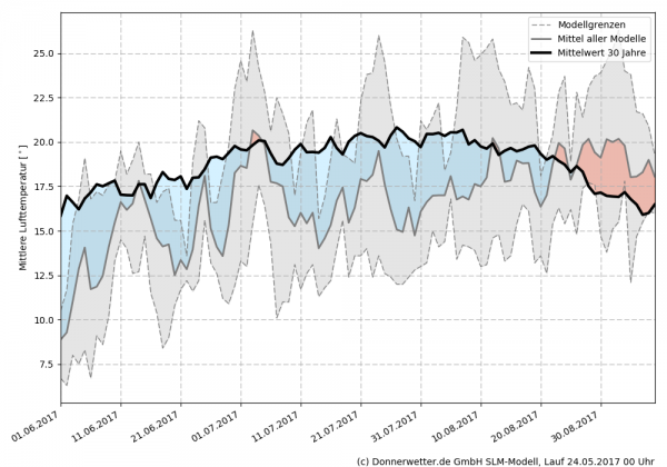 Im Westen des Landes sieht es aktuell nach einem insgesamt eher unterkühlten Sommer 2017 aus. Erst in der letzten Augustdekade liegen die Temperaturen für längere Zeit über den langjährigen Mittelwerten.