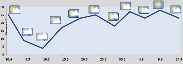 Zum Monatswechsel ist warmes und freundliches Wetter nur von kurzer Dauer: Bereits in den ersten Maitagen setzen sich kräftige Schauer durch und es wird merklich kühler.