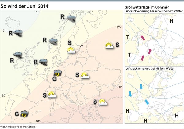 Ein schwülwarmer, teilweise wechselhafter Juni wird im Westen Europas erwartet. In Deutschland dürfte es in diesem Jahr häufig Schauer und Gewitter geben. Zudem ist in der Karte die mittlere Höchsttemperatur eingezeichnet.