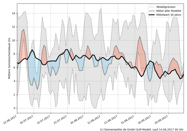 Auch in der Südhälfte sieht es nach wie vor nach einem insgesamt zu kühlen Sommer 2017 aus, zudem liegen die zu erwartenden Niederschlagsmengen meist über dem 30-Jahres-Mittel. Die Sonnenscheindauer zeigt sich über die Sommermonate weiterhin launisch, die sonnigsten Phasen erwarten uns zwischen Ende Juni und Anfang Juli sowie ab Ende August.