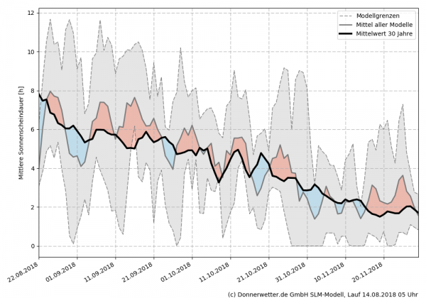 Unsere aktuellen Langfristprognosen für Lufttemperatur, Sonnenscheindauer und Niederschlagshöhe.