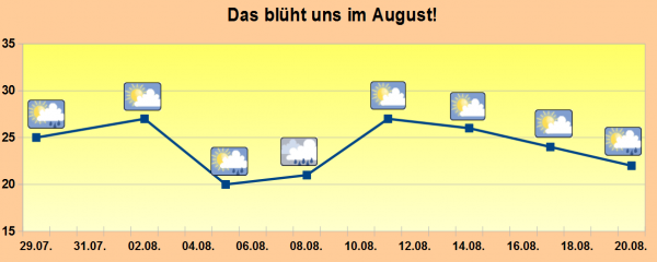 Die Tage um den 26. Juli herum sind oftmals noch warm und gewittrig. Mit Übergang in den neuen Monat lassen die Gewitter dann in ihrer Intensität nach, regionale Unwetter sind bei bestimmten Wetterlagen jedoch immer noch möglich.