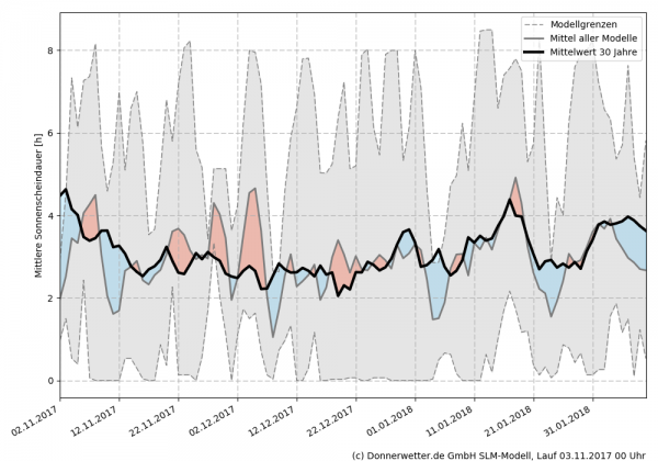 Der Süden darf sich freuen. Aber nicht etwa über spätherbstliche Sonnenstrahlen, sondern über außerordentlich kalte Temperaturen, die schon Ende November Schneefall wahrscheinlich machen. Bei anfänglich noch 5 °C im Schnitt fällt die Temperatur innerhalb von 15 Tagen für eine knappe Woche unter 0. Da gleichzeitig deutlich mehr Niederschlag fallen wird als man es zu dieser Jahreszeit gewohnt ist, kann man wohl von Schnee ausgehen. Weil es allerdings auch nicht aufhört weiter zu regnen, wenn die Temperaturen wieder ins Plus wandern, ist zwar die Freude aber auch so mancher Ärger über den Schnee wohl recht schnell wieder vorbei. Die Wolken verhindern nicht so sehr die Sicht auf die Sonne wie in den anderen Regionen Deutschlands, was eine durchschnittliche Sonnenscheindauer von 2-4 Stunden möglich macht.