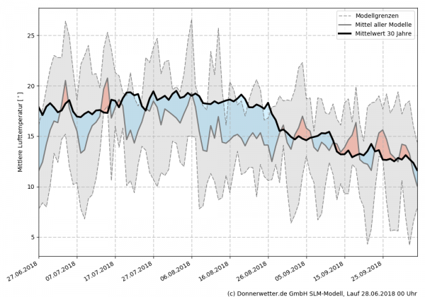 Bis auf wenige Ausnahmen bewegen sich die mittleren Lufttemperaturen im Süden in den nächsten Wochen unter dem langjährigen Durchschnitt, dabei ist es die meist Zeit zu niederschlagsarm. Die besten Chancen auf Sonne gibt es vor allem in der ersten Julihälfte.