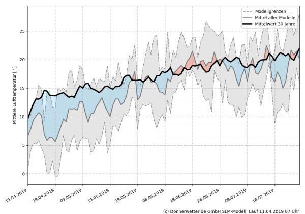 Die kommenden Wochen verlaufen laut aktueller Modellrechnungen im Süden zu kühl und zu trocken. Die Anzahl der zu erwartenden Sonnenstunden liegt bis Ende kommenden Monats mal über, mal unter dem langjährigen Mittel.