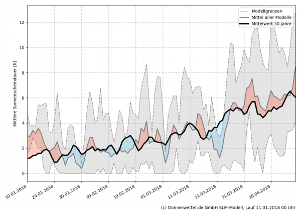 Unser aktuelles Temperaturmodell berechnet für den Norden in den nächsten Wochen und Monaten, abgesehen von einer kurzen milden Wetterphase zwischen Mitte Januar und Mitte Februar, überwiegend zu kalte Tage. Die zu erwartenden Niederschlagsmengen liegen dabei häufig, wenn in vielen Fällen auch nur leicht, über dem langjährigen Mittel. Überdurchschnittlich viele Sonnenstunden bringt vor allem noch der Rest des aktuellen Monats.