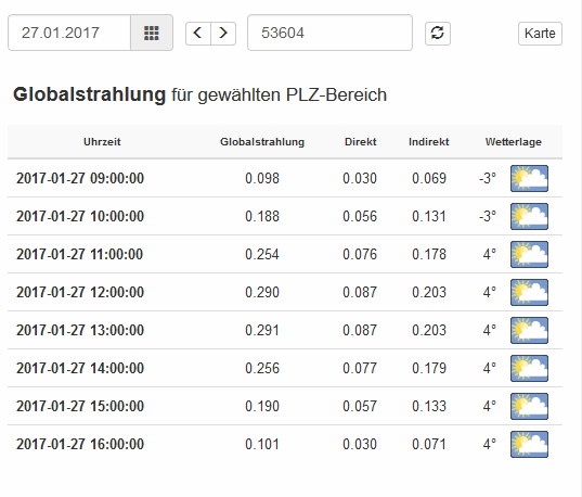 Nun können Sie in der oberen Zeile den Tag und Ihre PLZ auswählen (oder Sie klicken einfach auf ein Gebiet). In der abgebildeten Tabelle können Sie nun für die verschiedenen Uhrzeiten die Globalstrahlung einsehen. Angegeben wird Ihnen auch die direkte und indirekt Globalstrahlung.