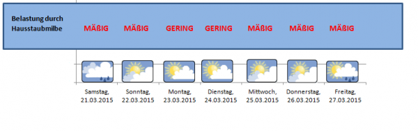 Durch die hohe Luftfeuchtigkeit und den Regen nimmt die Hausstaubmilbenbelastung am Wochenende deutlich zu. In der neuen Woche sinkt die Belastung dann wieder ab.