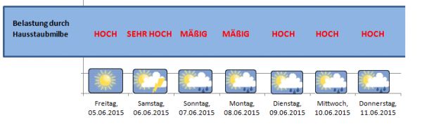 Die hohe Außenfeuchte lässt den Milbenkot quellen. Erst ab Sonntag geht die Belastung kurzzeitig zurück, steigt dann zum Dienstag aber wieder an.