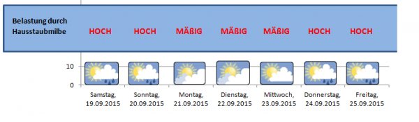 In der neuen Woche sinkt die Luftfeuchtigkeit und somit auch das Hausstaubrisiko dann wieder leicht.