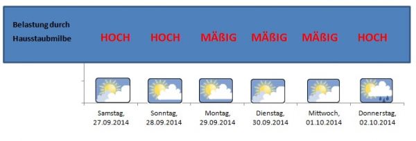 Ohne Entfeuchtung im Haus sind niedrige Luftfeuchtigkeiten bei der aktuellen Wetterlage nicht zu erreichen. Die Luftfeuchtigkeit wird vorerst bei rund 65 - 80 % verbleiben. Die Belastungen durch Milben sind daher mäßig bis stark.