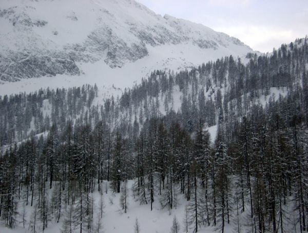 verschneite Lärchenwälder